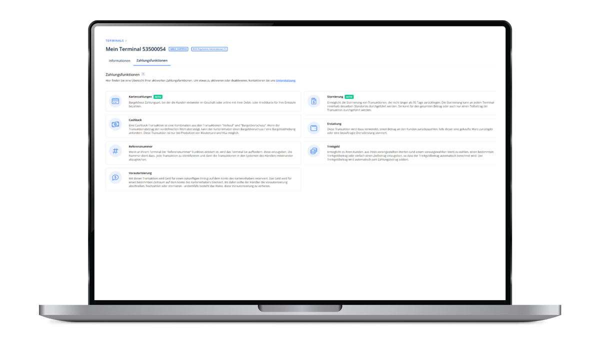 Im Reiter „Zahlungsfunktionen“ erhalten Sie eine vollständige Darstellung aller aktiven Funktionen Ihres Terminals.